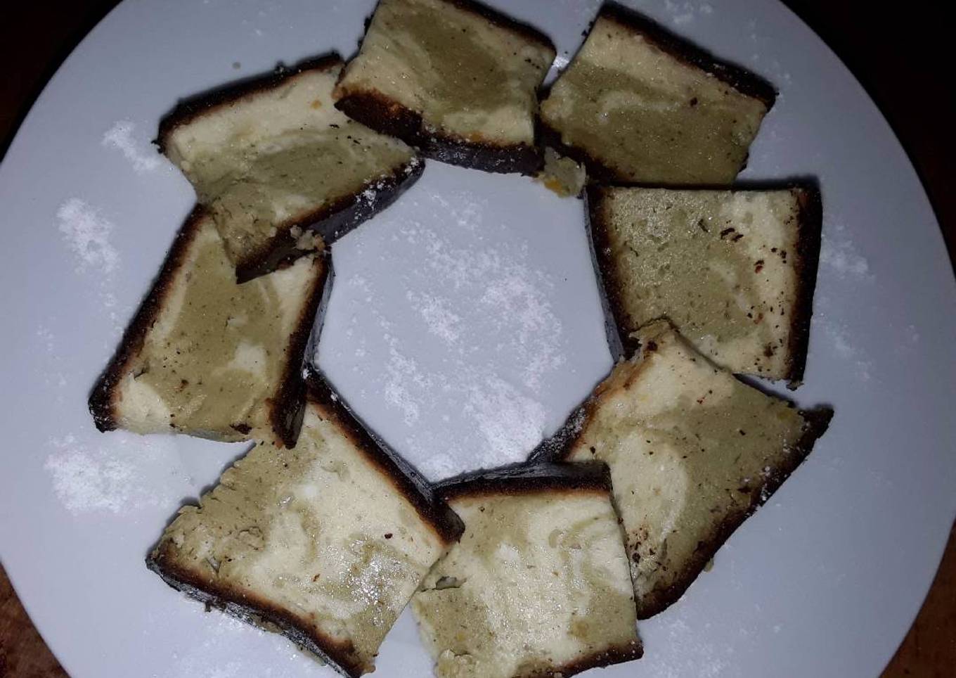 - Mix the rest of the quark well with the Matcha powder and the icing sugar with one of the halves.