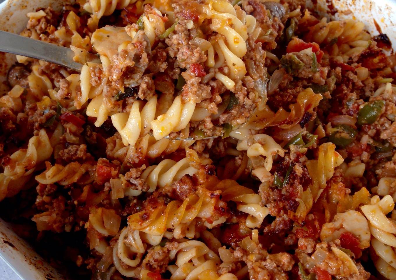 Cheesy, baked pasta casserole with ground beef and tomato sauce. Great for family dinner with kids or family get-togethers.