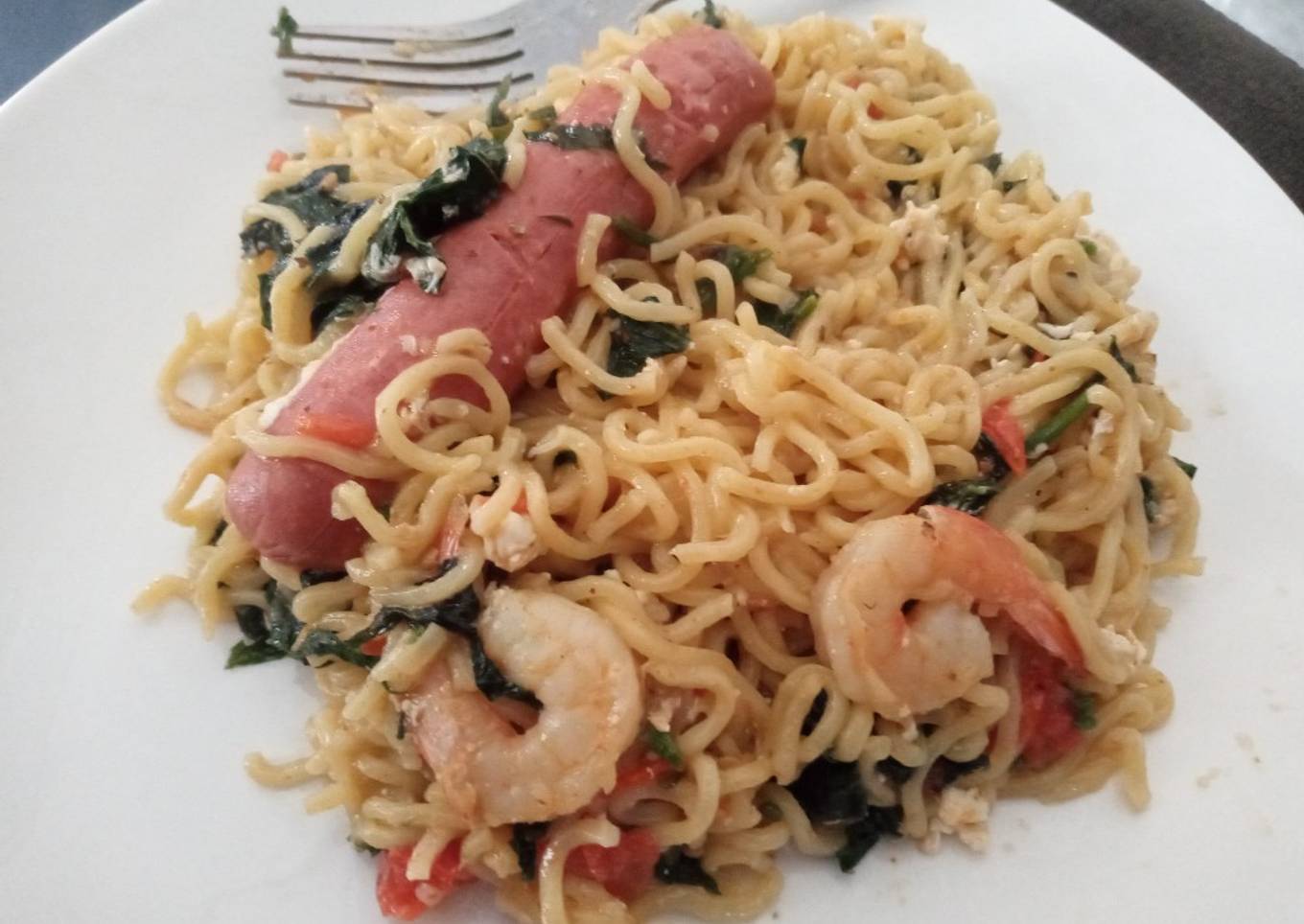 - Slightly fry the onion, garlic tomatoes and pepper....just slightly, to make it crushy,add the shrimps and sausage, add in the noodles season, stir.